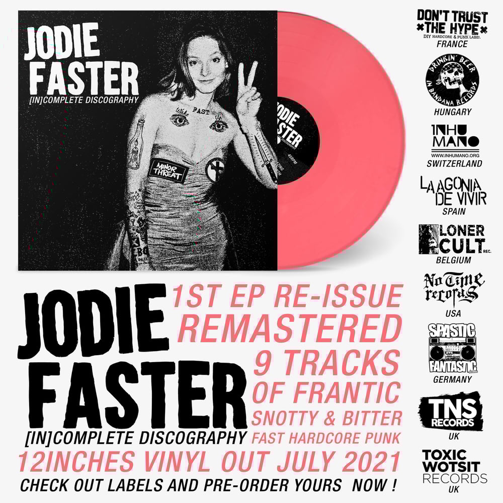 We’re very excited to bring you a remastered ‘[In]Complete Discography’ from fast hardcore punks Jodie Faster. After 5 tape pressings and 3 very limited vinyl pressings Jodie Faster’s first EP ‘Complete Discography’ has now been remastered and pressed on pink vinyl. You definitely want this record in your life.